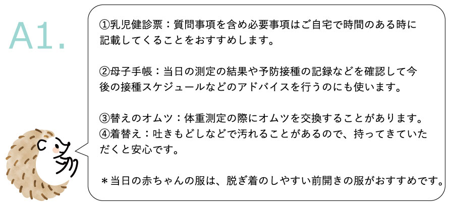 母子手帳、乳幼児健康診査受診表(各月齢用)を必ずお持ちください。